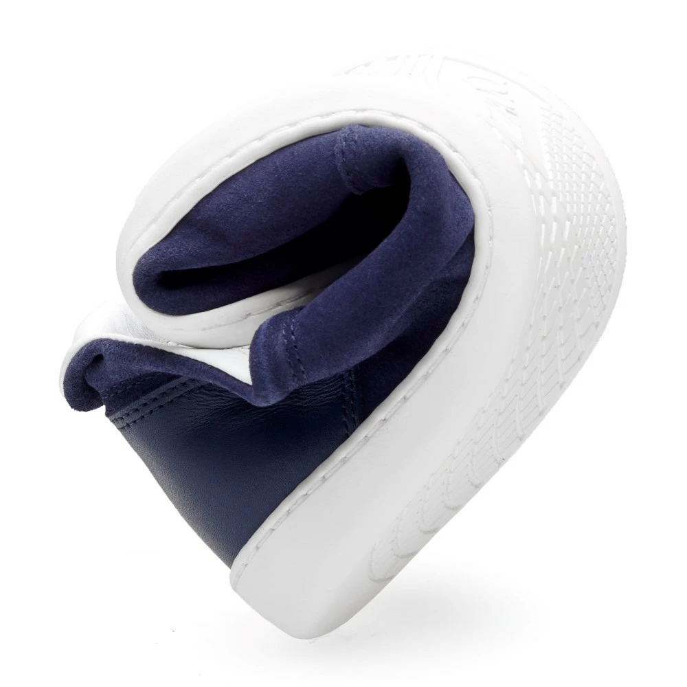 Das Obermaterial besteht aus hochwertigem Veloursleder, welches im Schnür- und Fersenbereich mit Nappaleder abgesetzt ist. Ton in Ton gehalten, greifen auch die Schnürsenkel den dunkelblauen Farbton auf. Mit dem Innenfutter aus anschmiegsamen, weißen Glattleder und der weißen Sohle erzeugen wir einen tollen Kontrast, wodurch der Barfußschuh leicht und modern wirkt.